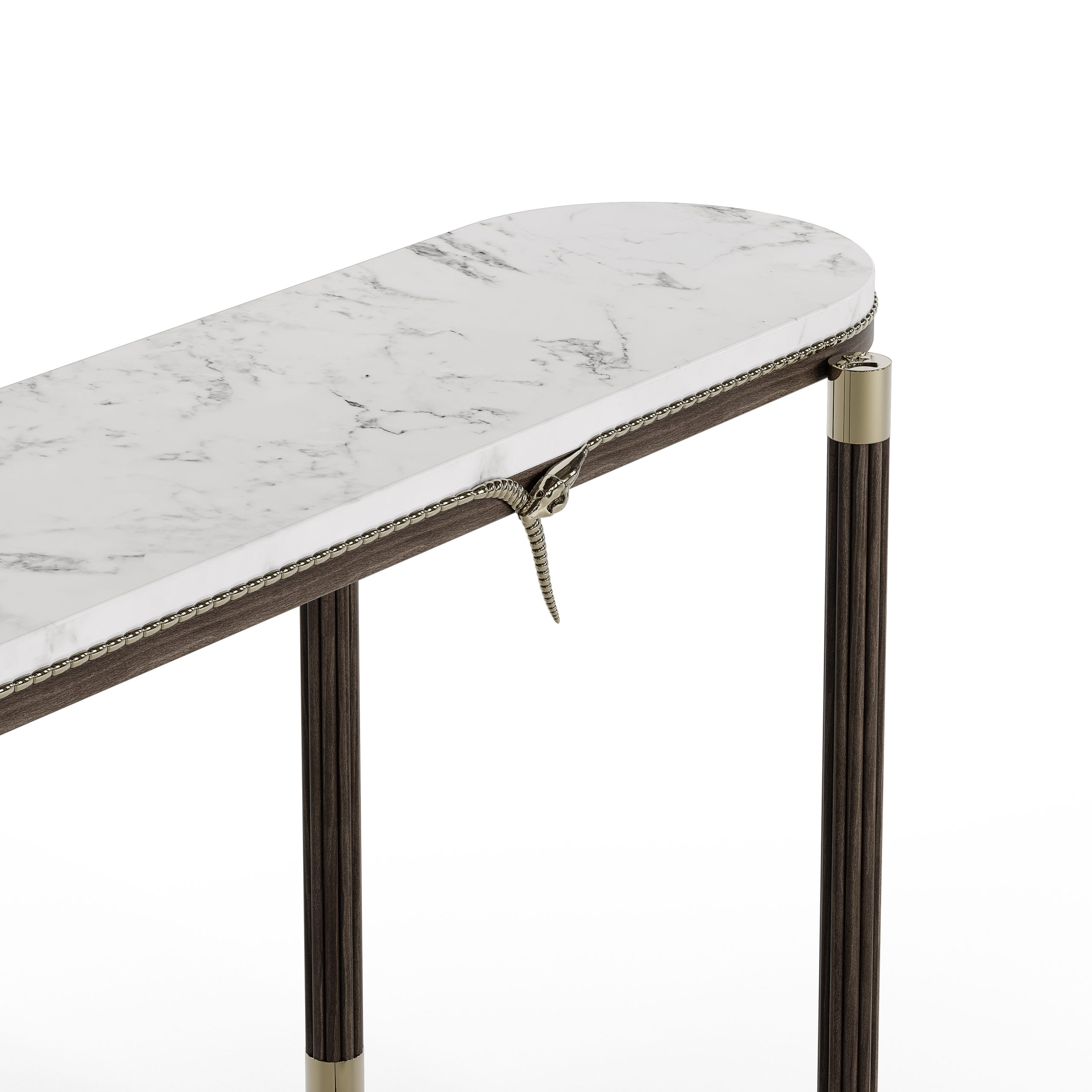 The Snake Console slithers into spaces with an air of mystery and sophistication. Inspired by the sleek movements of a serpent, its marble top appears to coil with intent, held delicately by slender, metallic details. A brass snake handle gracefully adorns the edge, further emphasizing its sinuous appeal.